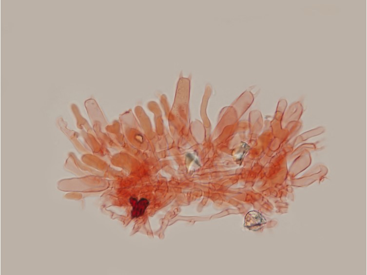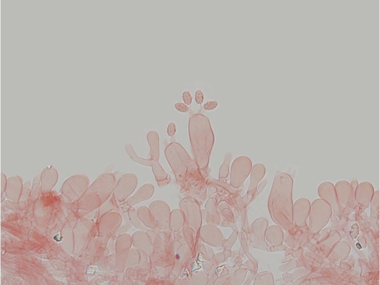 Basidia primarily 2- to 4-spored, clavate to barrel-shaped, approximately 10–29 × 5.0–7.5 µm, hyaline, clamped at the base. Sterigmata 3–5 µm long. Cystidia absent. Hyphal system monomitic; generative hyphae with clamp connections. Context hyphae hyaline, thin-walled, 1.75–3.0 µm diam., ampulliform septa 3.0–7.0 µm diam. Hymenium ≤ 41 µm thick. Subhymenium ca. 30 µm thick, composed of hyphae, 2.0–3.0 µm diam., thin-walled. Context with subparallel arranged hyphae 1.75–2.5 µm diam., thin-walled, branched, septate with clamped.