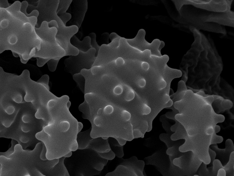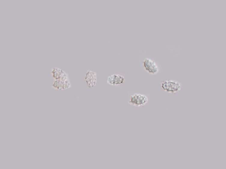 Basidiospores 4.5–5.5(–6.0) µm long, 2.5–3.0(–3.5) µm wide, excluding ornamentation, ellipsoid, coarsely echinate, hyaline in 5% KOH. Ornamentation acute warts or spines 0.5–1.0 µm long.