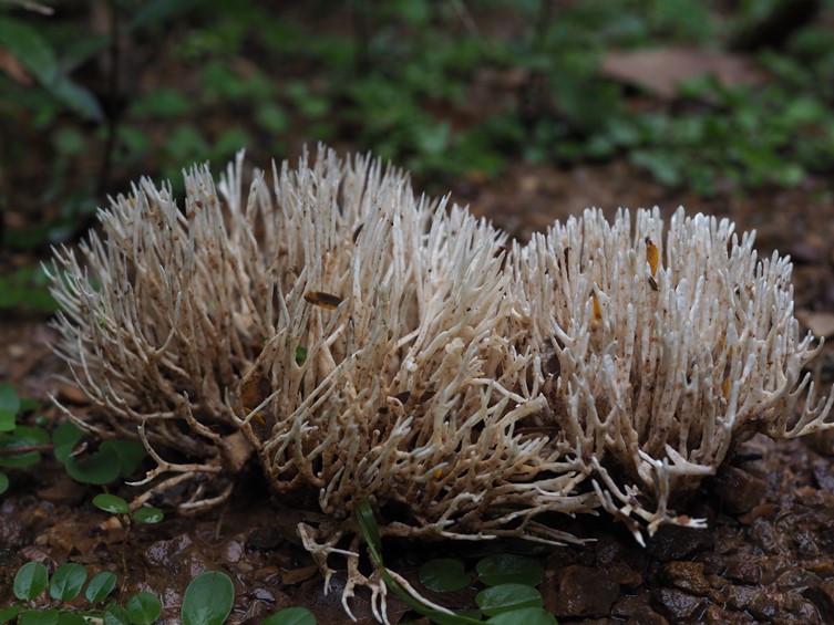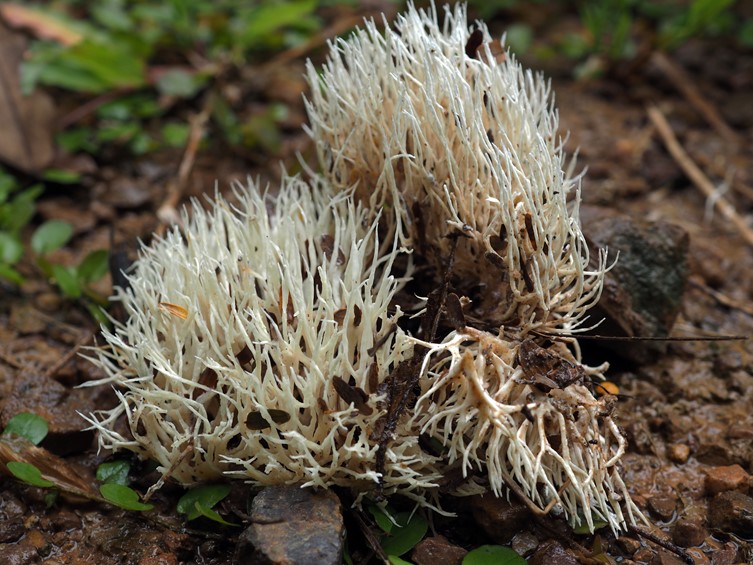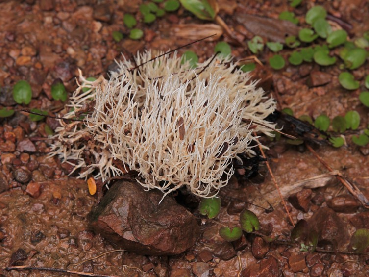 Basidiomata coralloid, 30–60(–95) mm high, 34–110(–130) mm broad, caespitose, densely branched, yellowish white, not changing when dried, palmately branched from flattened stipe immersed in the soil. Branches 1.5–2.5 mm diam., yellowish white, round in cross-section, dichotomous to trichotomous, axils V-shaped, apex subulate, rarely furcate (two-pronged fork), fresh tough and elastic. Stipe 10–20 × 2–3 mm, flattened, yellowish white. Context yellowish white, slightly coriaceous, dry, tough at the base of the stipe. All tissue unchanging where cut or bruised. Odor not distinctive.