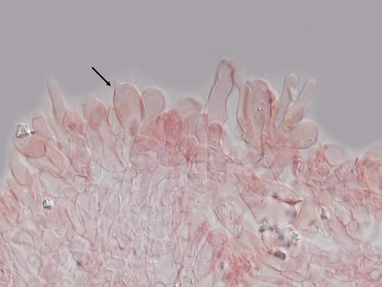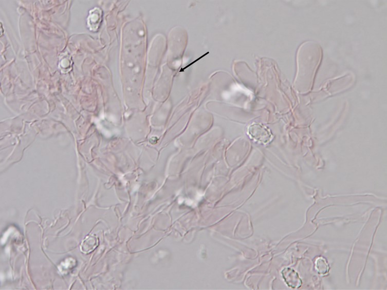 Basidia primarily 4-spored, clavate, approximately 15–26 × 5.0–10.5 µm, hyaline, clamped. Sterigmata 2 µm long. Cystidia absent. Hyphal system dimitic; generative hyphae with clamp connections, hyaline; skeletal hyphae hyaline, thick-walled, 2.5–3.0 µm diam. Hymenium ≤ 35 µm thick. Subhymenium ca. 20 µm thick, composed of hyphae, 2.0–5.0 µm diam., thin-walled. Context with subparallel arranged hyphae 2.5–5.0 µm diam., cylindrical and long-celled, some branches, clamped septate, slightly thick-walled 2.5–3.75 µm diam., ampulliform septa 3.75–5.0 µm diam.