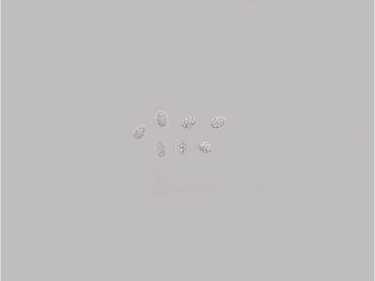 Basidiospores (3.5–)4.5–5.5(–6.0) µm long, 3.0–3.5(–4.5) µm wide, excluding ornamentation, ellipsoid, coarsely echinate, hyaline in 5% KOH. Ornamentation acute warts or spines 0.2–1.0 µm long.