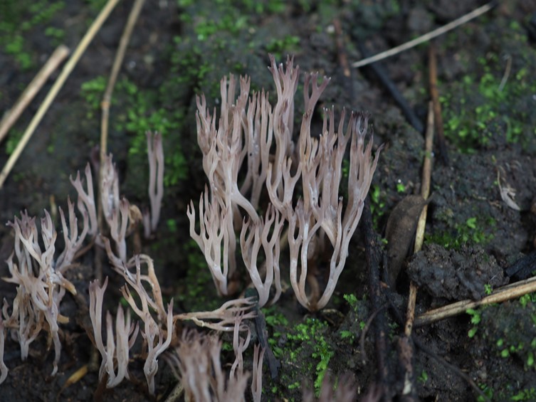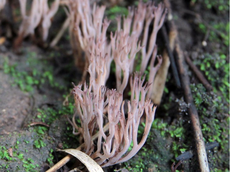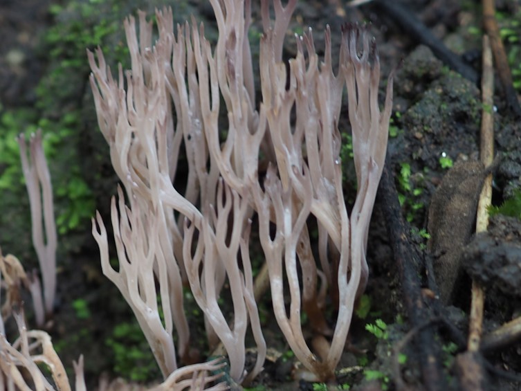 Basidiomata coralloid, 50–110 mm high × 30–50 mm broad, solitary or caespitose, loosely branched, very pale purple when fresh, brownish gray when dried. Branches 3–7 mm diam., round in cross-section, polychotomous, dichotomous, or rarely trichotomous in direction to the apex, primary lower branches 5–7 mm diam., very pale purple, secondary branches 3–6 mm diam., very pale purple, terminal branches 2–5 mm diam., grayish purplish red, axils V-shaped, tips acute, white, fresh soft, fragile, and brittle. Stipe 10–20 × 2–3 mm, solid, grayish brown. Context yellowish white, slightly viscid, rather tough at the base of the stipe. All tissue unchanging where cut or bruised. Odor not distinctive.