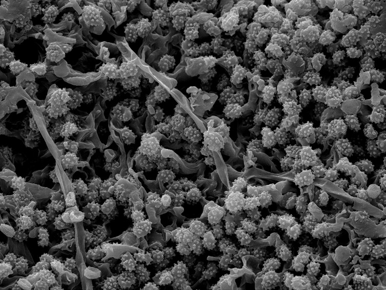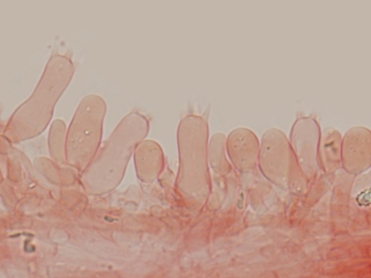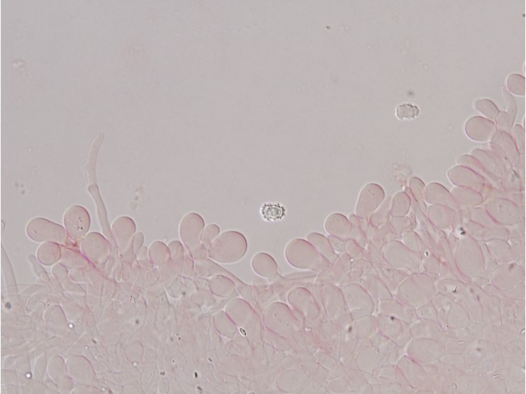 Basidia primarily 2- to 4-spored, clavate, barrel-shaped, approximately 11–26 × 5.5–11.0 µm with sterigmata 3–5 µm long, clavate, hyaline, clamped. Cystidia absent. Hyphal system monomitic; generative hyphae with clamp connections. Context hyphae hyaline, thin-walled, 1.25–6.25 µm diam., ampulliform septa 5.0–5.5 µm diam. Hymenium ≤ 37.5 µm thick. Subhymenium ca. 25 µm thick, composed of hyphae, 1.25–6.25 µm diam., thin-walled. Context with subparallel arranged hyphae 2.0–10.0 µm diam., thin-walled, branched, septate with clamped.