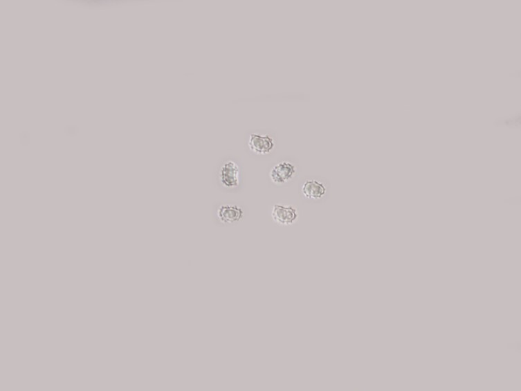 Basidiospores 4.5–6.0 µm long, 3.0–4.0 µm wide, excluding ornamentation, ellipsoid, coarsely echinate, hyaline in 5% KOH. Ornamentation acute warts or spines 0.5–1.2 µm long.