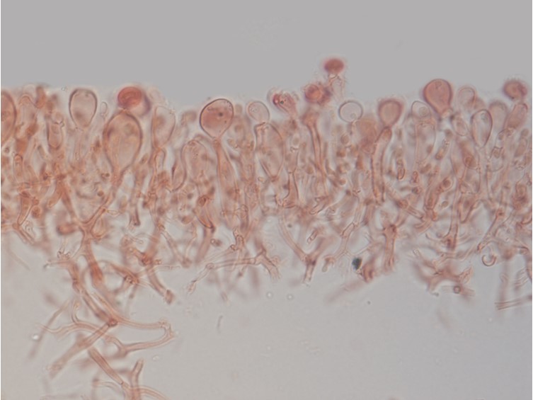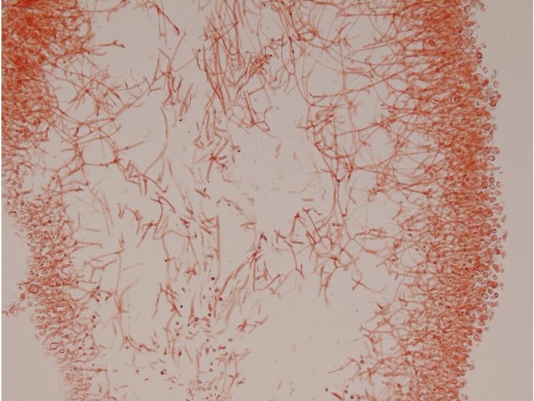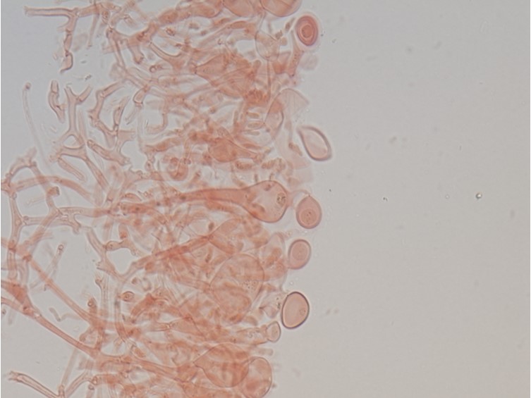 Basidiocarp foliose, lobed or forked, or with margins incrised or crenate or sometimes entire, fragiled undulate firm-gelatinous, white, up to 37 mm, diam and 19 mm high, dry becoming pale whitish yellow; lubes usually very thin. probasidia initials typically clavate, mostly proliferation from swollen and short hyphae, sometimes through the basidial clamps; mature basidia predominantly subglobose to ellipsoid, some globose or narrow clavate, 11–17.5 × 8–10 µm, longitudinally, obliquely, or diagonally cruciate-septate, mostly 4-, occasionally 2- spored; sterigma up to 45 × 2 µm, apically swollen up to 4–5 µm. Basidiospores broadly ellipsoid to ellipsoid, 7–8 × 5–6 µm, smooth, hyaline, germinating by budding, repetition or sometimes germ tubes. Conidia absent. Vesicles absent. Swollen cells; in the inner part of basidiocarps, shape variable, mostly subglobose to oval, 8–14 × 6.25–14 µm; the terminally and subterminally swollen cells of commercial basidiocarps on the sterile surface close to the substrate existing, terminal cells subglobose to oval, occasionally pyriform with short stalks, 32.5–50 × 16–35 µm, stalks up to 4–6 µm long; subterminal cells, mostly citriform, tapering both sides, occasionally oval to capitate, 35–52 × 16–27.5 µm, stalks up to 15 µm long. Hyphidia: absent. Haustoria abundant in basal parts close to the substrate, rarely in mature hymenium, clamped, haustorial hyphae often branched.