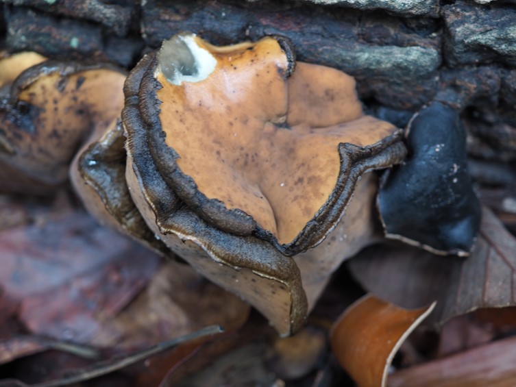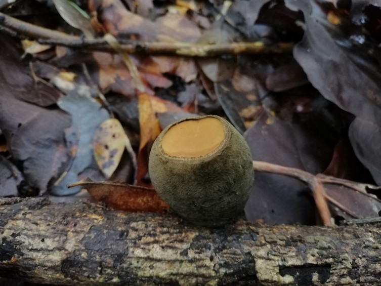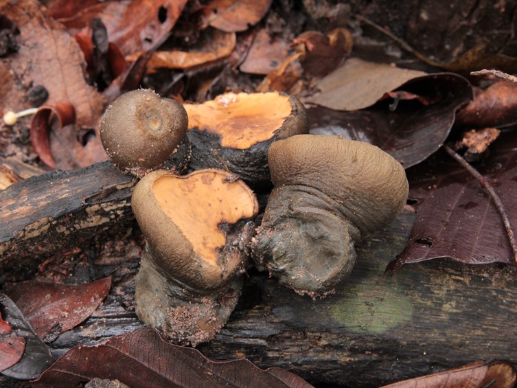 Apothecium looks like globet- or cup-shaped. The immature apothecium is more or less cylindric, wrinkled on the upper part, very dark grayish cyan of skin of apothecium, and hairy. The mature apothecium is exactly goblet-shaped with very dark grayish cyan on the surface, hairy, upper part of apothecium concave with soft orange, inside of apothecium fleshy gelatinous-rubbery and tough 2.3−3.0 cm in diam 3.2−3.6 in height. The