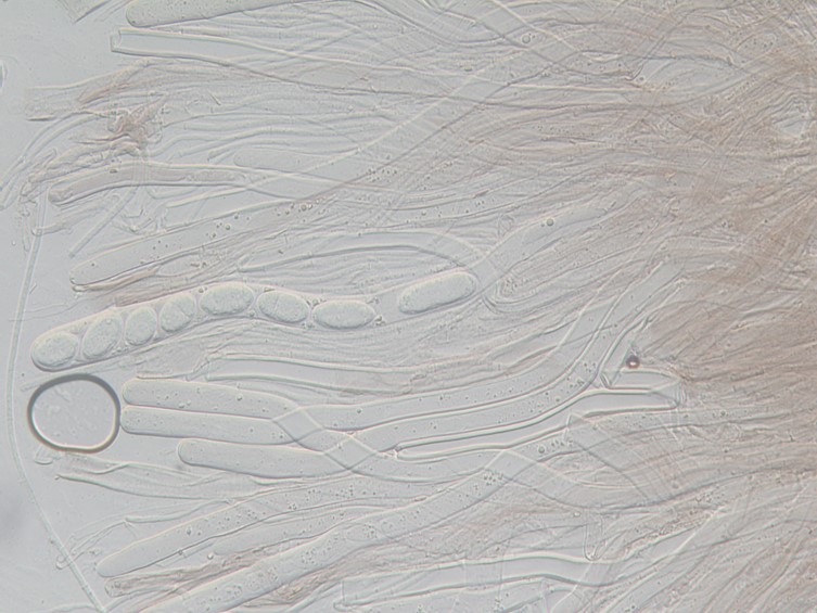Asci 8-spored, long tapering base, cylindrical, 375−400 × 15.0−22.5 μm.