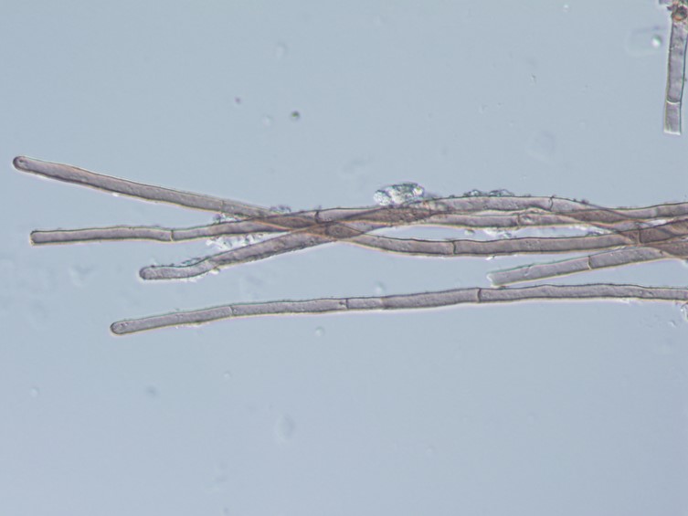 hair 25−100 × 3.8−7.5 μm, brownish cylindrical cell, rough surface’s cell, septate cell, and apically blunt. Paraphyses hyphae 400 μm in length, septate, filiform, longer than ascus. Excipular cells crowded, septate.