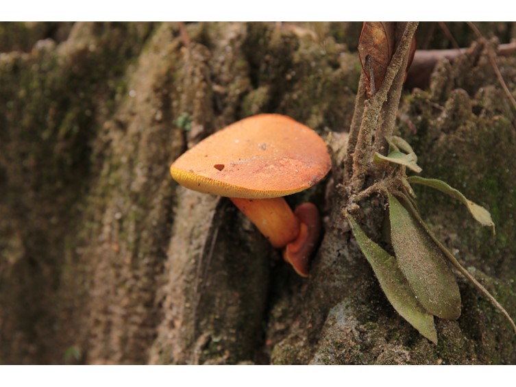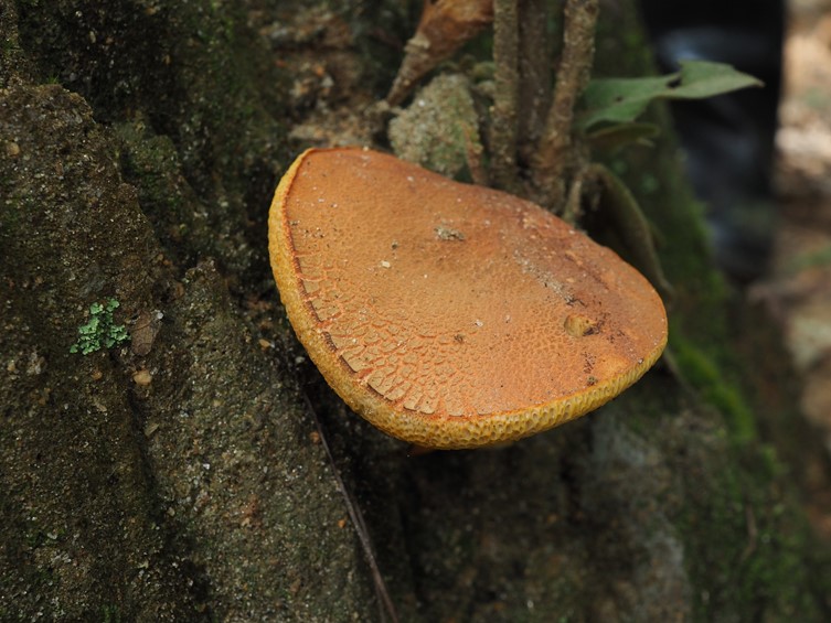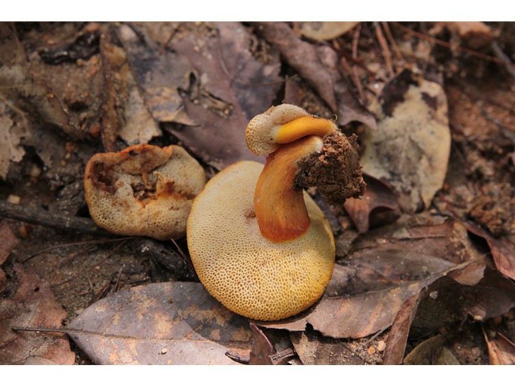 Pileus 25–70 mm, plano-convex, areolate, dry, velvety, becoming rimose at center, strong orange, unchanging when bruised, turning yellow with 3% KOH, unchanging with NH4OH, turning blue with FeSO4. Pore Surface light yellow, pores circular to angular, 1–2 per mm; tubes to 10 mm deep, unchanging with 3% KOH and NH4OH, turning blue with FeSO4. Stipe 30–50 mm long; 10–20 mm broad, insertion central, cylindrical or with a swollen base, solid, firm, dry, finely reticulate near the apex, strong orange, turning yellow with 3% KOH, unchanging with NH4OH, turning blue with FeSO4. Context white, soft, unchanging when bruised. Odor and taste unrecorded. Spore Print not observed.
