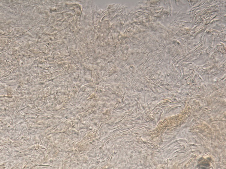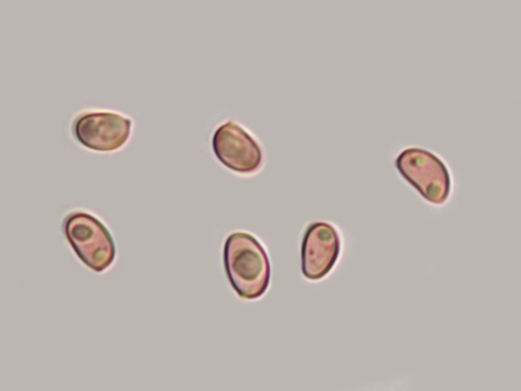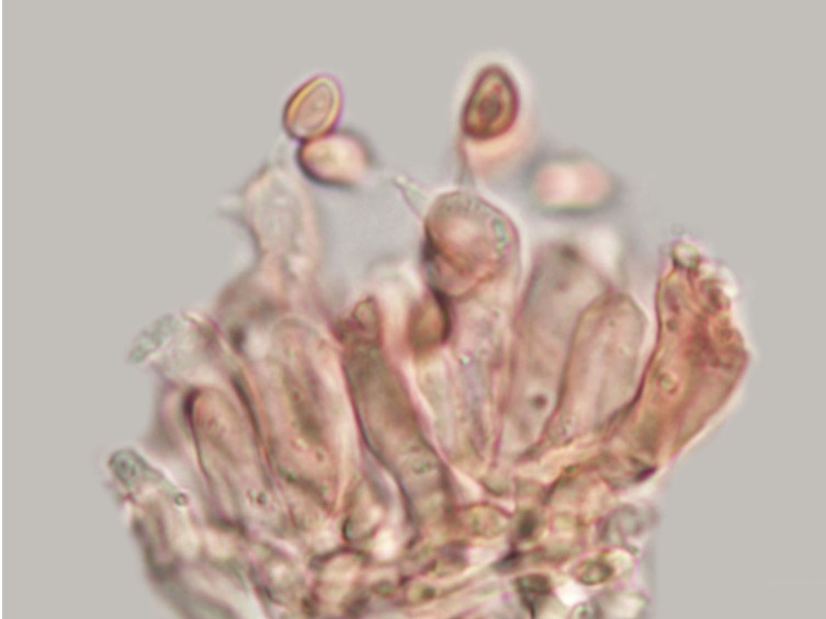 Basidiospores 5–7 × 3.5–5 µm; ellipsoid, smooth, hyaline, inamyloid. Hymenial cystidia 32–45 × 9–11 µm; lageniform to widely lageniform; occasionally mucronate; smooth or slightly roughened; golden yellow in 5% KOH. Pileipellis a partially gelatinized cutis of cylindric elements 2.5–12.5 µm wide; exserted ends cylindric with rounded apices; golden yellow in 5% KOH.