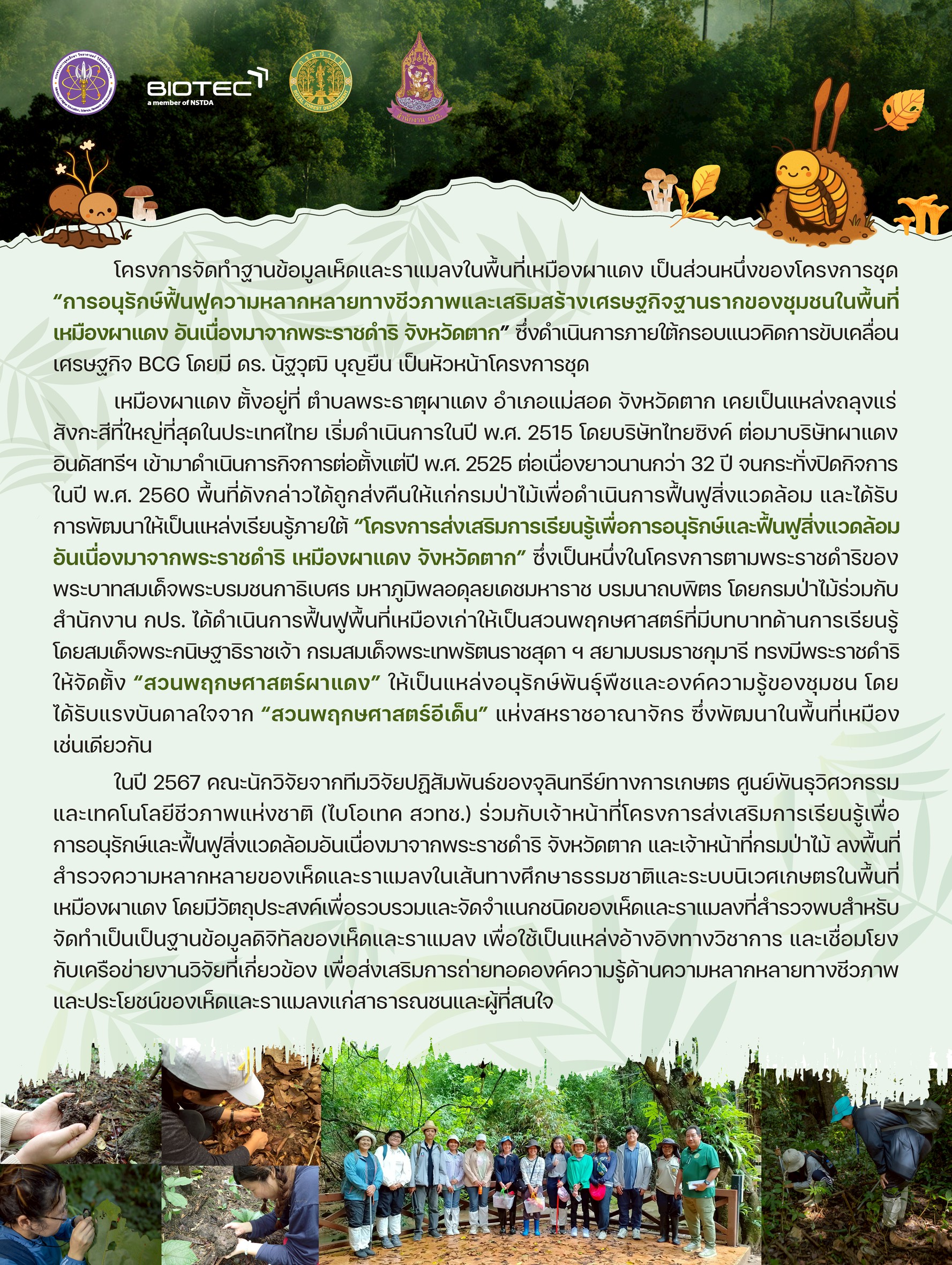 - เป็นส่วนหนึ่งของโครงการชุด "การอนุรักษ์ฟื้นฟูความหลากหลายทางชีวภาพและเสริมสร้างเศรษฐกิจฐานรากของชุมชนในพื้นที่เมืองผาแดง อันเนื่องมาจากพระราชดำริ จังหวัดตาก" ซึ่งดำเนินการภายใต้กรอบแนวคิดการขับเคลื่อนเศรษฐกิจ BCG โดยมี ดร. นัฎฐวุฒิ บุญยืน เป็นหัวหน้าโครงการชุด