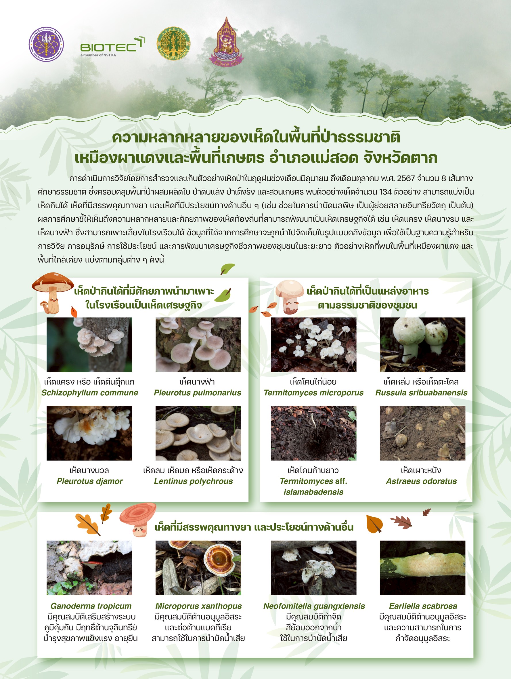 - การดำเนินการวิจัยโดยการสำรวจและเก็บตัวอย่างเห็ดป่าในฤดูฝนช่วงเดือนมิถุนายน ถึงเดือนตุลาคม พ.ศ. 2567 จำนวน 8 เส้นทาง ซึ่งครอบคลุมพื้นที่ป่าผสมผลัดใบ ป่าดิบแล้ง ป่าเต็งรัง และสวนเกษตร พบตัวอย่างเห็ดจำนวน 134 ตัวอย่าง สามารถแบ่งเป็น